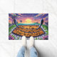 Un paillasson musical avec des notes se trouve devant un paysage pittoresque avec des îles et le coucher du soleil, flanqué de deux grandes cornes bleues qui s'avancent vers l'horizon. Bienvenue à vos proches dans le style avec ceci - Amuse notes de musique colorées Design For Your Feet Before Enter Doormat.