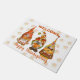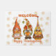 Ce design présente le texte orange "Bon thanksgiving" et "Bienvenue" avec trois mignons gnomes de jardin avec tarte, feuilles d'automne et citrouilles.