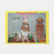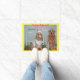 Ce tapis porte une fille récupératrice d'or qui ramasse des carottes dans un patch de carotte et un lapin récupérateur d'or qui mange les carottes. Le message dit : "Pâques chanceuses !".
