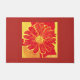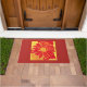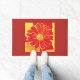 Tapis de porte dans une image graphique moderne rétro d'une grande fleur d'aster marguerite, en rouge vif et jaune doré, contre un arrière - plan rouge et jaune safran, et bordé d'un rouge profond