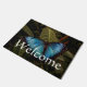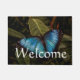 Le papillon Morpho bleu montre ses ailes bleues brillantes (5 à 8 pouces de longueur) tout en se reposant sur le feuillage à Butterfly Wonderland. Photo de Ruth Jolly. Le texte peut être customisé pour répondre à vos besoins.