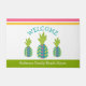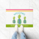 "Bienvenue". Apportez un peu d'hospitalité tropicale dans votre maison de plage avec ce tapis de portes chic et moderne. 3 ananas modernes, graphiques, turquoise, bleu turquoise, vert, rose et orange, rayures rose et orange, typographie manuscrite bleu turquoise, avec votre nom de famille/message sur une bande verte printanière, recouvrent un arrière - plan blanc. Ajoute une ambiance festive et amusante à votre porte d'entrée ! Il vous suffit de taper vos informations avec le modèle facile à utiliser, et vous pouvez facilement personnaliser ce tapis de bienvenue. S'il vous plaît, envoyez-moi un message avec toute question ou demande.