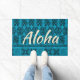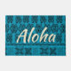 colorway turquoise. Le message d'Aloha accueille vos visiteurs dans votre propre paradis tropical. Les tapas hawaïens antiques sont l'inspiration de ce design primitif utilisé dans les cultures polynésiennes et hawaïennes. Ces types de dessins étaient souvent imprimés sur des chemises et pareaus aloha pour les danseuses traditionnelles hula. Ce design se décline en plusieurs couleurs. Vous pouvez customiser le message.