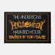 Tapis de bienvenue de maison hantée en noir et orange cool avec votre propre texte personnalisé en police en détresse. Les éffrayantes lettres orange se courbent autour d'une Jack-o'-lantern au centre du mot. Personnalisez avec votre nom de famille pour une fête en octobre sur ce tapis de portes personnalisé déplaisant.