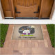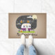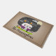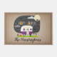 Rv camper-caravane violet et blanc décoré pour l'halloween avec l'araignée, les toiles d'araignée, le maïs-bonbons, le chat noir, les flamants squelettes, la pierre tombale, le chat noir et Jack-o'-lantern sous un ciel étoilé, pleine lune et chauves-souris. Le texte dit, "des campeurs heureux"