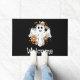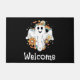 Un tapis de bienvenue avec l'illustration d'un fantôme souriant. Décoré de fleurs, arcs-en-ciel et chauves-souris.