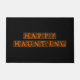 "Happy Haunting" texte ornemental en lettres orange vif, un design humoristique et sophistiqué pour une Halloween hantante.