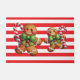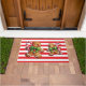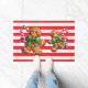 Christmas door mat is shown with a cute gingerbread man and a red and white stripes print.