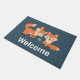 Un tapis de bienvenue avec une illustration graphique de 2 renards oranges à l'air mignon et heureux. Arrière - plan vert foncé.