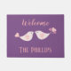 Bienvenue à vos invités dans votre maison à l'aide de ce joli tapis de portes. Avec un arrière - plan violet, "Welcome" est écrit en haut en caractères cursifs roses. En dessous se trouvent deux inséparables roses. En-dessous, vous trouverez un endroit pour insérer votre nom. Commandez dès aujourd'hui !