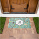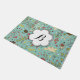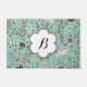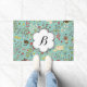 Jardin d'agrément lunatique, un beau, coloré, amusement, conception lunatique de crème, brun foncé, corail, bleu, et fleurs et oiseaux de vert sur un joli arrière - plan de bleu d'aqua. Cet amusement, tapis de porte coloré et lunatique comporte une bannière de forme de fleur blanche que vous pouvez facilement personnaliser avec votre initiale de monogramme !