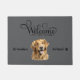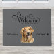 Ce paillasson avec un chien Retriever doré est le cadeau idéal pour tout amateur de chiens. Ce design est complet avec les mots "Bienvenue chez nous", un espace pour ajouter votre nom et celui de votre chien, ainsi qu'un graphique aquarelle adorablement mignon de Retriever doré. Profitez !