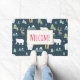 Un tapis de porte d'accueil avec un motif festif fantaisiste. Ours polaires, rennes, arbres, renards et flocons de neige. Sur un arrière - plan vert foncé.