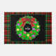 Créez un tapis de portes festif et personnalisé pour les vacances. Festive couronne verte colorée avec un arc rouge orné de décorations de Noël rouge, rose, violet et jaune. Bordure de plaid rouge et vert.