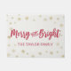 Ce flocon doré "joyeux et lumineux" porte de Noël est la décoration de vacances moderne parfaite. Le design comprend un cadre de faux flocons de feuilles d'or et une police rouge élégante mais festive qui dit "joyeux et lumineux". Personnalisez le tapis de porte avec votre nom. Remarque : Ce design ne comporte pas de véritable feuille d'or. C'est un graphique de haute qualité fait pour ressembler à une feuille d'or chatoyante.