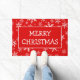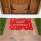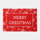 Ce tapis de porte est doté d'un accueil personnalisable, qui se lit actuellement "Joyeux Noël" avec un rectangle rouge blanc taillé sur un arrière - plan rouge couvert de flocons de neige de différentes tailles. Changez facilement le message d'accueil en "Bonnes Fêtes" ou tout autre texte de taille similaire sur la page du produit!