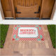 Ce tapis porte présente un accueil de vacances gai dans une typographie victorienne moderne sur un arrière - plan rayé rose et rouge.