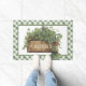 Ce paillasson fantaisiste de la Saint-Patrick représente une boîte de trèfle avec le mot "chanceux" sur le devant. Il y a une bordure verte et blanche à carreaux assortie sur le bord.