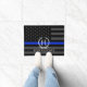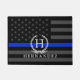 Une natte nommée décorée d'un monogramme et faite sur commande comportant une ligne bleue mince police a dénommé le drapeau américain. Le monogramme est centré à l'intérieur de d'une guirlande stylisée blanche avec le texte de nom de famille en texte blanc dessous. Une manière élégante et élégante de faire une impression sur votre seuil tout en représentant le bleu.