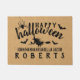 Natte classique et élégante de Halloween pour la chute - texte "de Halloween heureux" avec des chauves-souris, une sorcière de vol, une araignée, et votre nom de famille