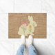 Tapis de porte avec la silhouette de couleur claire d'un lapin de Pâques avec des fleurs de printemps en burlap look arrière - plan. Idéal dans n'importe quelle maison pour un décor rustique de printemps. Conception par Alma Wad.