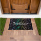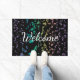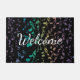 L'arc-en-ciel de explosion note le paillasson de natte de musique. Les notes musicales pourpres de rose et de lavande d'or de vert bleu éclatent à l'extérieur du centre sur un tapis noir avec le texte bienvenu personnalisable. Perfectionnez pour en dehors de votre studio ou maison et un grand cadeau pour votre musicien ou mélomane préféré. Le texte peut rester comme est ou le changer en celui que vous préfériez.