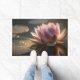 Un joli tapis porte avec une photo closeup d'un beau lotus rose fleurissant à la lumière du matin.