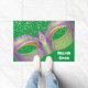 Ce tapis de portes est affiché en vert avec une empreinte d'étoiles dorées avec une impression festive Mardi Gras Carnival Mask. Customisez cet objet ou achetez tel quel.