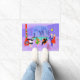 Ce Mat de la Porte de Noël Tropical est assez festif pour égayer les perspectives de vacances de n'importe qui ! Le dessin animé présente le type de fête de Noël extrêmement sophistiqué qui n'est normalement visible que dans les films de Noël des années 1960. Un salon moderne du milieu du siècle est rempli de fêtards qui apprécient la décoration chic et violette. Une jolie femme en uniforme de domestique française porte un plateau de martinis. Elle se tient à côté d'une cheminée rouge à cônes avec un feu rugissant. Trois bas verts sont accrochés avec soin par la cheminée mod. Au centre de la pièce, un beau couple s'installe dans des chaises à oeufs d'orange. La femme porte une robe festive et verte. L'homme porte un costume noir avec une cravate rouge. Ils tiennent chacun un martini. Un autre couple devient cosy sous un lustre suspendu, jaune, Spoutnik. Le distingué homme aux cheveux gris porte un costume bleu, une chemise bleu clair et une cravate rouge. Il porte aussi un chapeau de Père Noël et tient un martini dans chaque main, montrant au monde que ses jours de fête sont loin d'être terminés. Son compagnon est une blonde en forme dans une robe rouge étonnante. M. Distinguished ferait mieux de faire attention parce qu'elle tient une pointe de faux-pied dans sa main. A l'avant de la pièce, un sapin de Noël kitsch et rose, orné de turquoises ornements et d'une étoile jaune. Derrière cette scène, on peut voir à travers des murs en verre du sol au plafond. La scène extérieure dispose d'une piscine ronde et turquoise. On peut voir la silhouette violette d'une femme plongeant ses jambes dans l'eau. Entre les murs violets et en pierre, il y a des silhouettes de palmiers ornés de décorations et de lampes de Noël. Les silhouettes de danses et de fêtards parlants sont également visibles. S'il y a une chose que cela prouve, c'est que, tandis que les gens qui vivent dans des maisons en verre ne devraient pas jeter de pierres, ils devraient certainement jeter des fêtes !