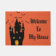 Tapis de porte en noir arrière - plan et imprimé maison hantée Halloween. Customisez ce tapis ou achetez tel quel.