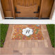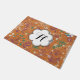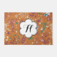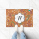 Une belle décoration composée d'oiseaux volants à la floraison de vin, turquoises et blancs sur un arrière - plan orange couleur rouille plein de jolis petits fleurs sauvages et de pandelions turquoises, blancs et de vin. Ce tapis de porte ludique, coloré et fantaisiste comporte une bannière en forme de fleur blanche que vous pouvez facilement personnaliser avec votre monogramme initial!