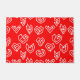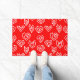 Ce tapis de portes a un design moderne de Valentin du milieu du siècle, avec des mazes de coeur blanc éparpillés sur un champ de rouge.