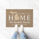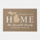 Stylish "Welcome to our home" objets doormat a typographiy design with state of Michigan map. Personalize with your family's last name monogram and your city name Includes a burlap background layer with a rustic textured appearance. Neutre, beige, et white colors.