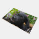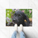 Un joli chiot noir Labrador Retriever, portrait drôle dans un jardin. Photo d'un jeune chien aux yeux de chiot prise par Katho Menden. Ce tapis de porte HELLO est une idée cadeau pour animal de compagnie et amoureux de les chiens.
