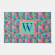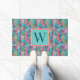 Ce beau tapis monogrammé porte présente un motif préppy d'ananas dans les tons rose, turquoise et jaune sur bleu marine. Personnalisez le monogramme avec votre choix d'origine.