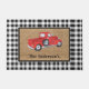 Vintage camionnette rouge au-dessus d'un faux burlap sur un arrière - plan de plomberie/chèque en noir et blanc. Personnalisez-vous avec votre propre nom.
