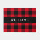 La natte de motif de contrôle de buffle rouge et noir de ce style de bûcheron a une bande noire à travers le centre avec un nom de famille en texte blanc. Personnalisez avec votre propre nom ou pour donner comme cadeau.