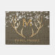 Pays chic, natte personnalisée par andouillers de cerfs communs de parties scintillantes d'or de toile de jute parfaite pour l'hiver ou un brun de vacances de Noël de pays, arrière - plan rustique minable de texture de faux de toile de jute. Nom de famille personnalisé au fond dans la couleur d'or, lettres élégantes. L'initiale enorme et assortie de monogramme avec un effet d'ombre est centrée au-dessus d'une paire de fête, andouillers de cerfs communs de mâle de parties scintillantes d'or. Des flocons de neige rustiques et blancs sont dispersés plus de la moitié supérieure et ont un effet usé et embouti. Accueil rustique pour des invités devant un cabine de rondin confortable. Cadeau chic et décoré d'un monogramme de pays d'hiver de pendaison de crémaillère, cadeau de Noël de famille, ou cadeau unique de wedding shower pour les nouveaux mariés. Note : Toutes les images sont imprimées. Parties scintillantes ou toile de jute non réelles. Décor élégant pour les vacances d'hiver ou pour des chasseurs ou des amoureux des animaux de cerfs communs. Parez votre perron avec un thème d'animal de forêt de région boisée de vacances ou d'hiver de parties scintillantes d'or !