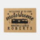 Ajoutez votre nom de famille à ce panier rustique chic de ferme avec un arrière - plan imitation burlap et des silhouettes noires, parfaites pour les RV. Il comprend une photo d'une maison à moteur avec les coeurs et les mots "Bienvenue à notre maison à moteur", plus deux lignes de votre texte personnalisé. Choisissez entre deux tailles de tapis de portes.