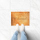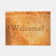 Bienvenue à votre visiteur avec un tapis de portes de style européen. Style italien et méditerranéen, mur de briques foncé rugueux, rugueux, couleur terre cuite colorée avec le plâtre craqué. Couleurs chaudes avec soleil. Avec le texte : Bienvenue !