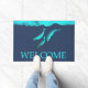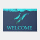 On y trouve trois narvals nageant sous la glace arctique, ainsi qu'un texte intitulé "BIENVENUE". Le narval, Monodon monoceros, est apparenté à la baleine béluga et vit dans l'Arctique toute l'année. Ils se trouvent principalement dans les eaux du Groenland et du Canada, rarement au sud du 65e parallèle de latitude nord. Les mâles pèsent jusqu'à 1 600 kg (3 500 lb), les femelles pèsent environ 1 000 kg (2 200 lb). Le plus grand narval jamais trouvé pesait 3 500 livres. Ils ont la forme d'un béluga et ont environ quatre pouces de gras isolant. Les narvals se rassemblent normalement en groupes d'environ cinq à dix individus. L'été, plusieurs groupes se réunissent pour former de plus grands regroupements. Narwhal est dérivé du mot nár de l’Ancien Norse, qui signifie "cadavre", faisant référence à la pigmentation grisâtre et martelée de l’animal, comme celle d’un marin noyé. Les narvals sont les plus sombres quand les jeunes deviennent plus blancs avec l'âge. La caractéristique la plus visible du narval mâle est sa simple défensive tordue de 2-3 mètres (7-10 pi). Il s'agit d'une dent d'inciseur qui se projette du côté gauche de la mâchoire supérieure et forme une hélice gauchiste. Le nom scientifique du narval, Monodon monoceros, est dérivé de "one-tooth one-horn". La défensive peut mesurer jusqu'à 3 mètres (9,8 pi) de long, comparativement à une longueur corporelle de 4-5 mètres (13-16 pi), et peser jusqu'à 10 kilogrammes (22 lb). Environ un mâle sur 500 a deux défenses, ce qui se produit lorsque l'inciseur droit, normalement petit, pousse également. Un narval féminin peut aussi produire une défensive, mais cela se produit rarement, et il y a un seul coque enregistré d'une femelle avec deux défenses. Ce comportement est censé maintenir les hiérarchies de domination sociale. Parfois, les narvals mâles se frottent les défenses ensemble dans une activité appelée "étouffement". La raison de ce comportement est inconnue ; il peut être de "gratter une démangeaison" (la base de la défensive est généralement infestée de poux) ; ou traversée de défenses peut être un accueil amical. La théorie la plus largement acceptée pour le rôle de la défensive est similaire à la crinière d'un lion ou aux plumes de queue d'un paon. Il peut aider à déterminer le rang social, à maintenir les hiérarchies de domination ou à aider les jeunes hommes à développer les compétences nécessaires à la performance dans des rôles adultes. Les narvals ont rarement été observés en se servant de leur défensive pour combattre ou adopter d'autres comportements agressifs ou pour briser la glace de mer dans leur habitat arctique. Narwhal se déroule généralement à un rythme tranquille, respirant lentement et roulant, mais sont remarquablement rapides lorsqu'ils se sentent menacés. Parfois, ils voyagent en petits groupes familiaux et communiquent au moyen d'une grande variété de cris, de trills, de sifflets et de clics. Les narvals ont une alimentation relativement restreinte et spécialisée. Leur proie est principalement composée de flétan du Groenland, de morue polaire et arctique, de crevettes et de calmar Gonatus. Les autres objets trouvés dans les estomacs comprennent le loup, le capelan, les oeufs de patinage et parfois les roches, ingérés accidentellement lorsque les baleines se nourrissent près du fond. On ignore comment le narval attrape sa proie. Certains scientifiques pensent que le narval assombrit leur proie de son comme les dauphins. Le Narwhal présente des migrations saisonnières avec une haute fidélité de retour dans les aires estivales libres de glace préférées, généralement dans les eaux peu profondes. En hiver, ils se retrouvent principalement dans les eaux hauturières, plus profondes, sous une épaisse banquise, surfacés par des fissures étroites dans la glace de mer, ou des chenaux. Les Narwhal du Canada et de l'Ouest du Groenland hivernent régulièrement dans la banquise du détroit de Davis et de la baie de Baffin, le long de la pente continentale, avec moins de 5 % d'eau libre et de fortes densités de flétan du Groenland. L'alimentation en hiver représente une part beaucoup plus importante de l'apport énergétique des narvals qu'en été et, en tant que prédateurs marins, ils sont uniques dans leur exploitation réussie des écosystèmes arctiques des eaux profondes. La plus remarquable de leurs adaptations est la capacité à effectuer des plongées profondes. Lorsqu'ils se trouvent sur leur site d'hivernage, les narvals font quelques-unes des plongées les plus profondes jamais enregistrées pour un mammifère marin, plongeant à au moins 800 mètres (2 400 pieds) sur 15 fois par jour, avec de nombreuses plongées atteignant 1 500 mètres (4 500 pieds). Les plongées à ces profondeurs dernier environ 25 minutes, y compris le temps passé au fond et le transit vers le bas et le retour de la surface. Dans les terrains d'été peu profonds, les narvals plongent à des profondeurs entre 30 et 300 mètres (90-900 pieds). Les seuls prédateurs des narvals, outre les humains, sont les ours polaires et les orques. Les Inuits sont autorisés à chasser légalement cette espèce de baleine pour leur subsistance. Le climat du nord fournit peu de nutrition sous forme de vitamines qui ne peuvent être obtenues que par la consommation de phoques, de baleines et de morses. Presque toutes les parties du narval, de la viande, de la peau, de la graisse et des organes sont consommées. Mattak, le mot pour peau brute et le blubber, est considéré comme un mets délicat, et les os sont utilisés pour les outils et l'art. Dans certains endroits du Groenland comme le Qaanaaq, les méthodes traditionnelles de chasse sont utilisées, et les baleines sont harponnées de kayaks faits main. Dans d'autres régions du Groenland et du nord du Canada, on utilise des bateaux à grande vitesse et des fusils de chasse. B