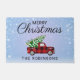 Bienvenue à vos invités cette saison de vacances avec une touche d'élégance. Personnalisez ce tapis de bienvenue élégant avec votre nom de famille. Design dispose d'un camion plaid noir et rouge, sapin de Noël à l'arrière du camion, "Joyeux Noël" dans la typographie moderne élégante avec un arrière - plan enneigé festif. Un complément parfait à votre décor de vacances et cadeaux pour famille et amis. Joyeuses fêtes !