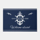 Porte nautique en lisant votre nom personnalisé de bateau entouré d'un puits de navire et ancre sur bleu marine moderne avec mouettes ainsi qu'une deuxième ligne de texte prêt à être personnalisé.
