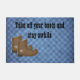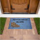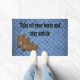 Tapis de porte à thème occidental, avec arrière - plan plaid bleu graphique et une paire de bottes marron, dans le coin inférieur gauche. Retirez vos bottes et restez un moment, en gras noir, peut être personnalisé pour lire ce que vous voulez.