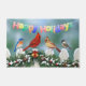 Une collection d'oiseaux chanteurs sur une clôture recouverte de neige décorée de guirlandes de Noël. Les espèces d'oiseaux comprennent le bleuet de l'est, les cardinaux rouges du nord et les poulets à capuchon noir. La clôture est ornée d'une guirlande de Noël constituée de branches de pin, de cônes et de baies sèches, agrémentée de cloches à sonnettes d'or et d'un ruban rouge vif.