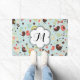 Notre tapis design Happy Birds in Fields of Flowers est si joli, amusant, fantaisiste et coloré que vous êtes sûr de tomber amoureux de lui! Un joli modèle d'oiseaux, de fleurs et de coeurs fantaisistes en vert, crème, corail, chocolat et bleu, ce tapis de porte ludique, coloré et fantaisiste est doté d'une bannière en forme de fleur blanche que vous pouvez facilement personnaliser avec votre initial monogramme !