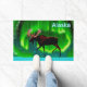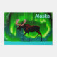 Une image toujours si légèrement stylisée d'une silhouette d'orignal contre les aurores boréales. Le texte "Alaska" apparaît en bleu et blanc brillant.