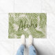 Papkolea Beach est l'une des plages les plus colorées d'Hawaii, située sur la pointe sud-est de Big Island. Le sable est vert grâce à l'olivine minérale du cône de cendres volcaniques. Nous avons créé ce design à partir de l'inspiration des couleurs de cette plage et ajouté des palmiers qui ventilateur les brises au-dessus. Les couleurs sont des tons verts de palmiers et des naturelles sablonneuses. Notre tapis de sol dit "Aloha" accueillant vos invités à votre belle maison de plage!