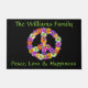 Un signe de paix fleuri dans les tons rose, jaune, orange, violet, vert, blanc et noir. Le texte, la police et la couleur de police peuvent être customisés selon vos besoins. Il suffit de cliquer sur le bouton "Customiser ceci". Veuillez noter que cette option est disponible en plus petite taille dans une liste séparée.