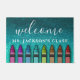 L'arrière - plan de faux parties scintillant bleu turquoise semble briller. Parties scintillant de crayons de couleur arc-en-ciel en rose chaud, violet, bleu, turquoise, vert, or, orange et rouge. Le texte en gras blanc indique "bienvenue" dans la police de tableau de bord. Mettez facilement à jour le nom ou le titre de la classe de l'enseignant. Disponible dans beaucoup d'autres couleurs et designs arrière - plans pétillants.